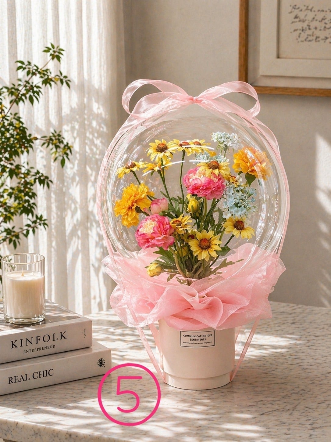 造花のため、枯れなくて長持ちするので、長い間ディスプレイして楽しめます。アクアバルーンの透明感がとてもキレイです。