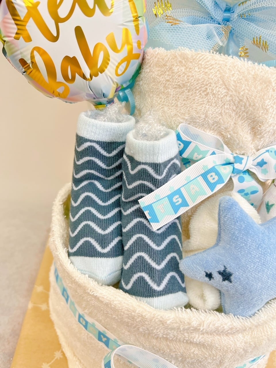 バルーン屋さんの風船が入ったカワイイおむつケーキです。